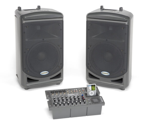 d’une console de mixage à 10 voies, de deux enceintes à deux voies alimentées par un amplificateur de 500 Watts.